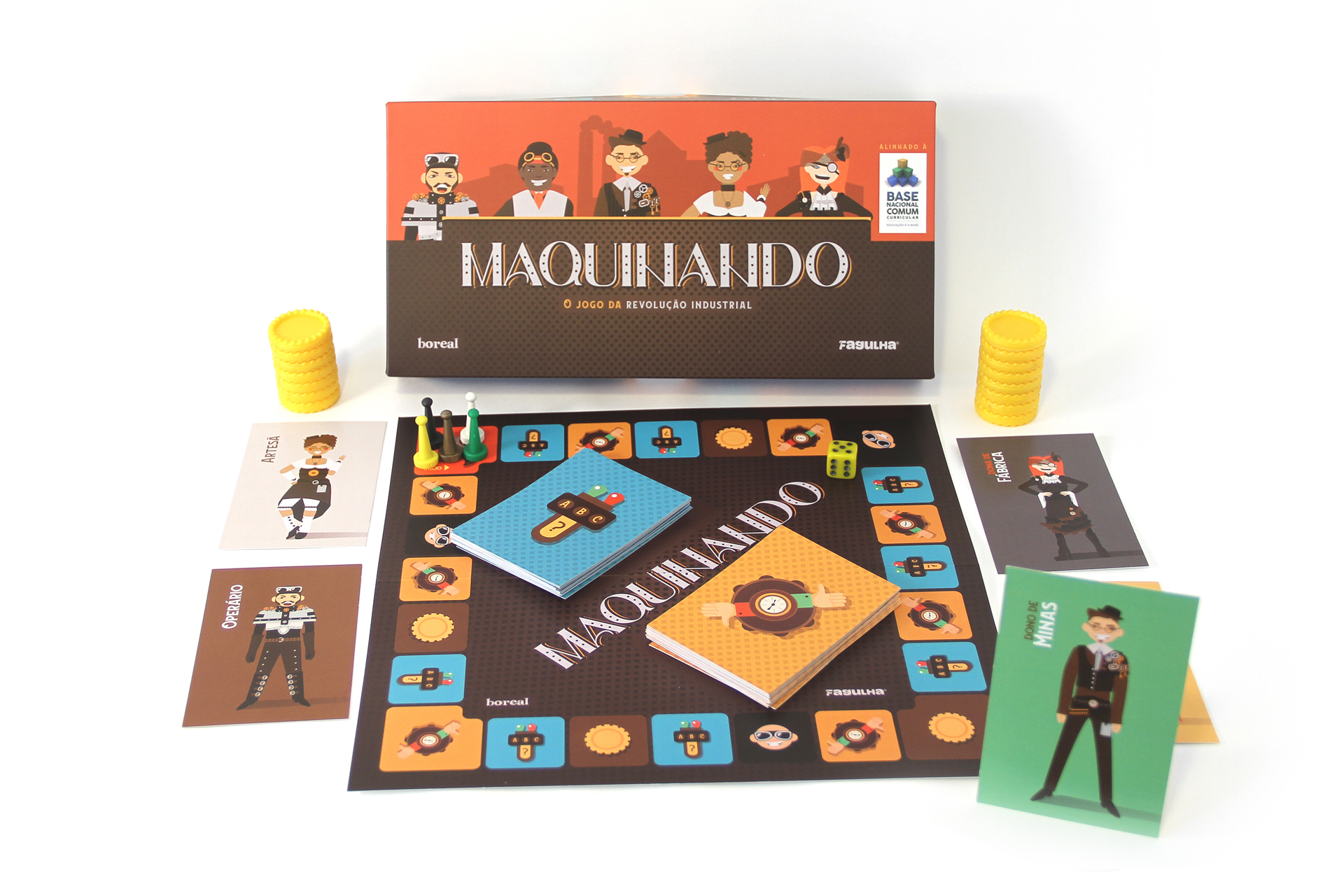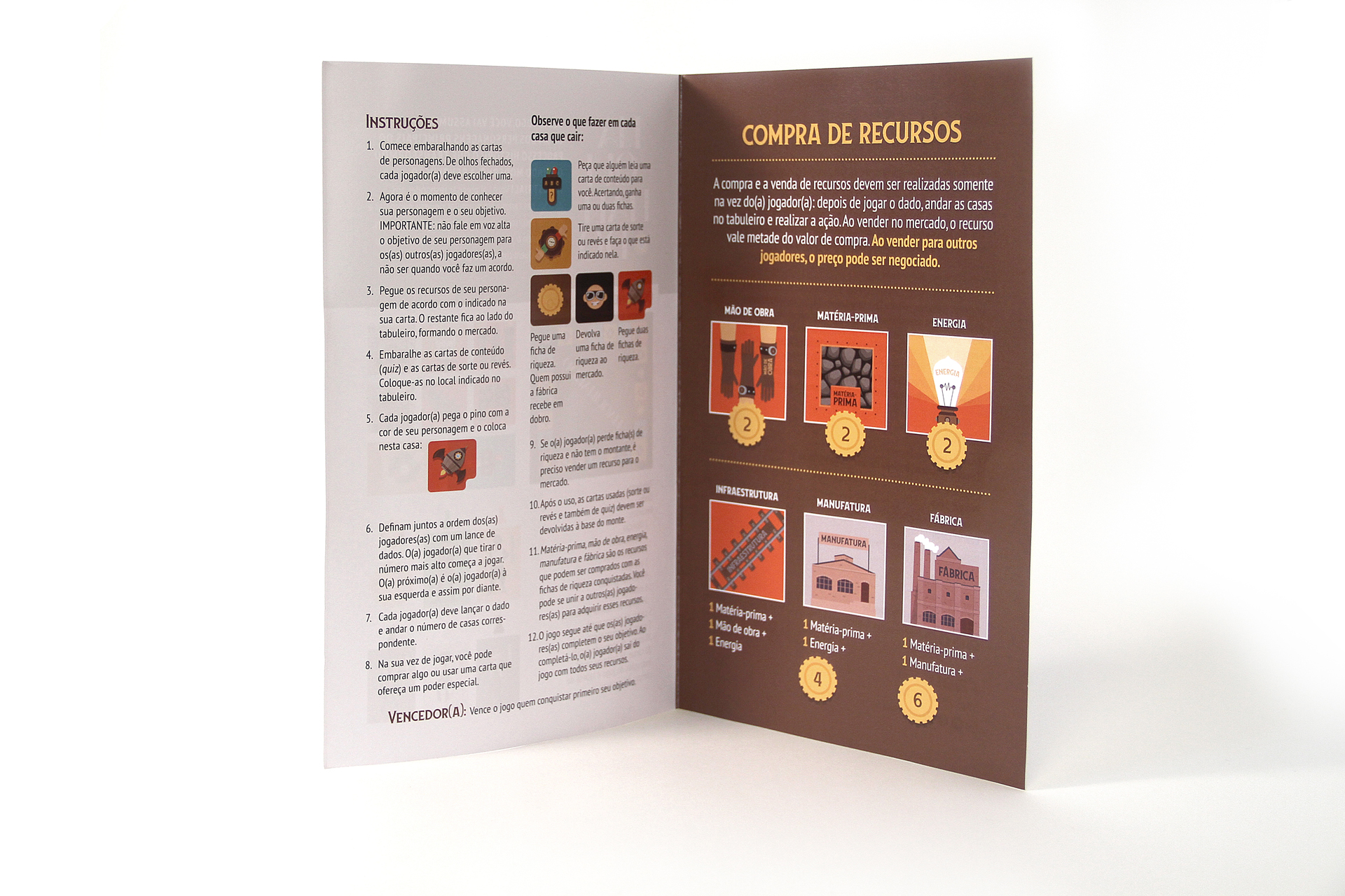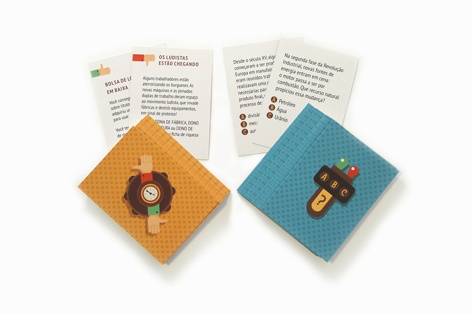20 cartas de sorte ou revés contendo situações e fatos históricos que podem afetar um ou mais personagens + 20 cartas-quiz, contendo perguntas sobre a revolução industrial e que valem fichas de riqueza.