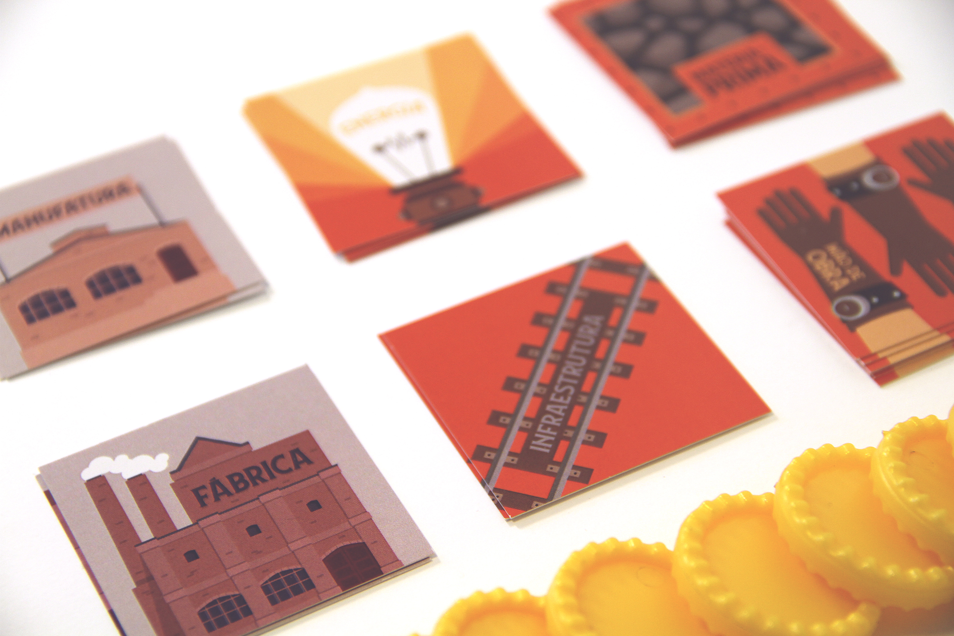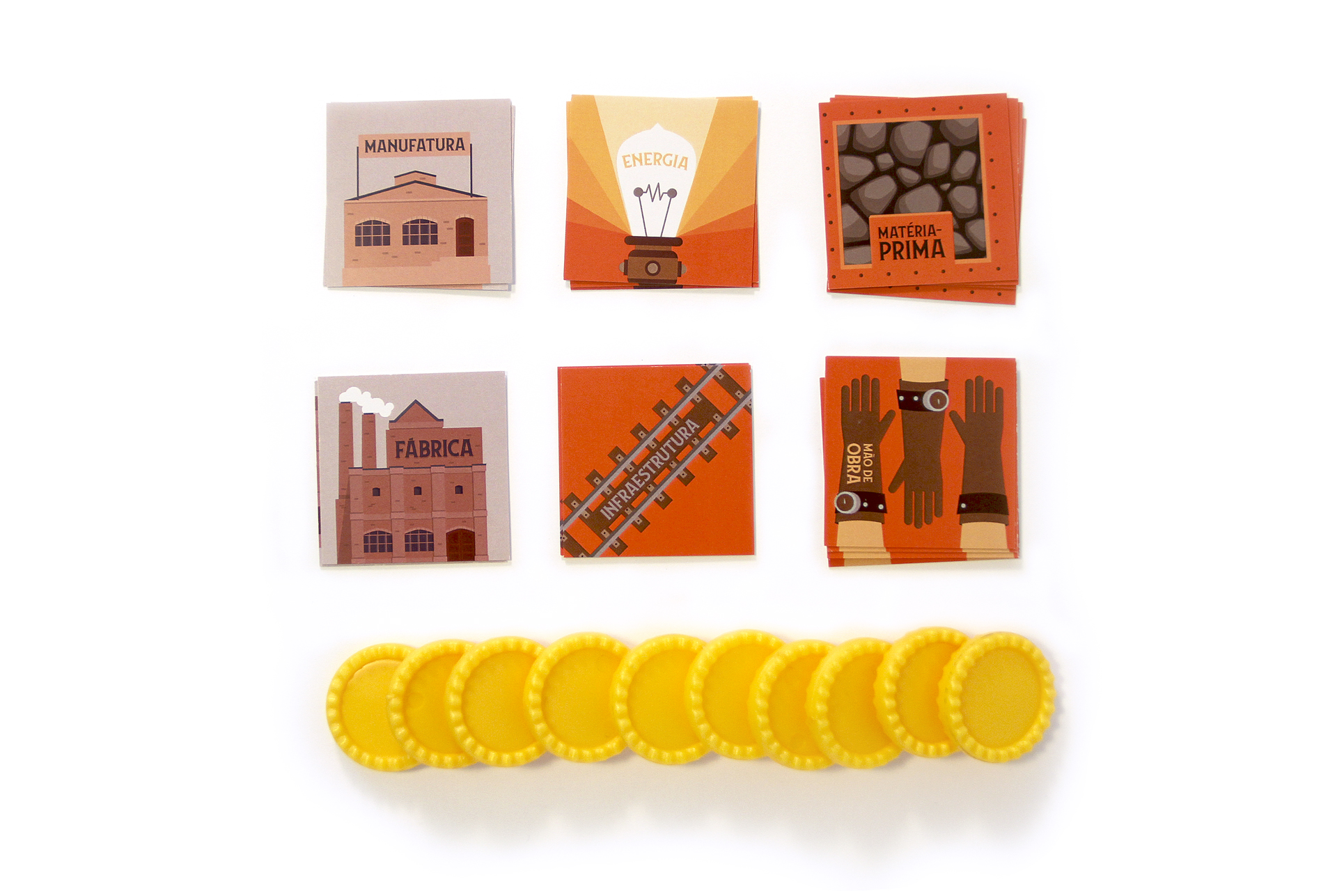 que podem ser comprados e vendidos com fichas de riqueza (24): mão de obra (6), matéria prima (4), energia (3), infraestrutura (2), manufatura (2) e fábrica (2).